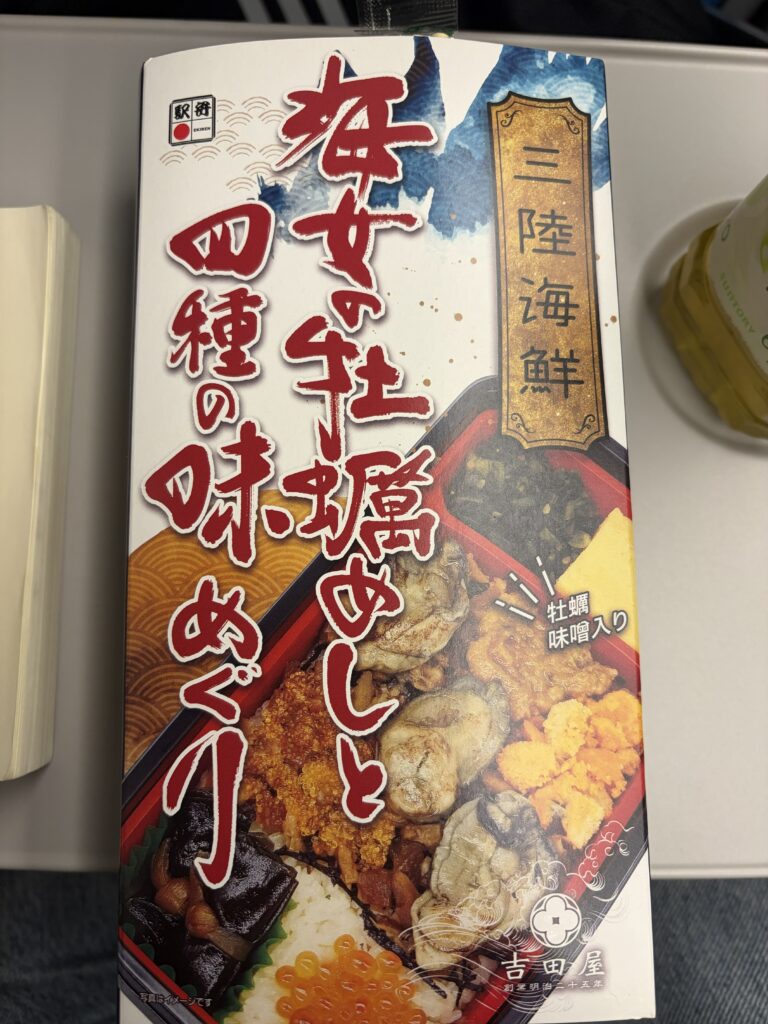 駅弁は三陸海鮮海女の牡蠣めし四種の味めぐり(昆布の巻物がすごくうまかった)