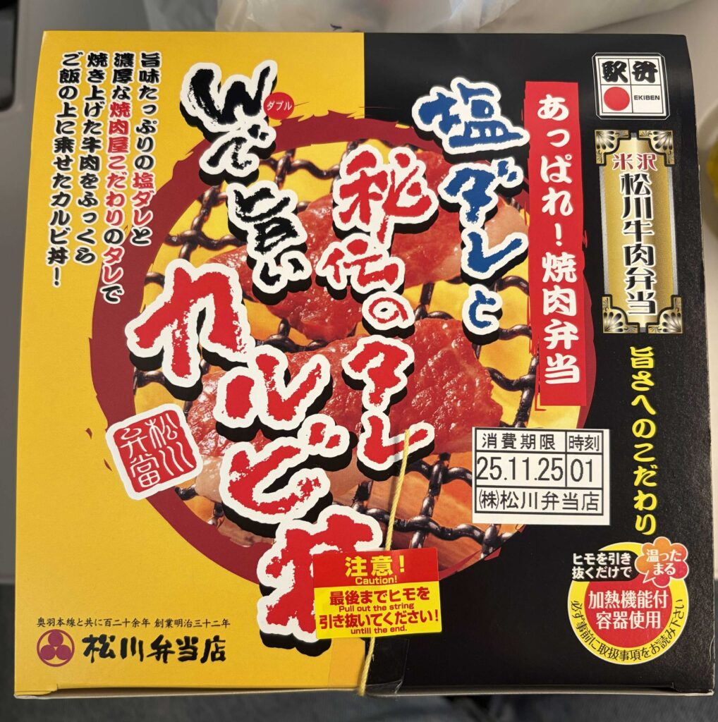 あっぱれ焼肉弁当塩だれと秘伝のタレWで旨いカルビ丼(紐を引くと温まるので新幹線でも熱々で食べられる、めちゃくちゃ熱くなる笑、漬物もうまい)