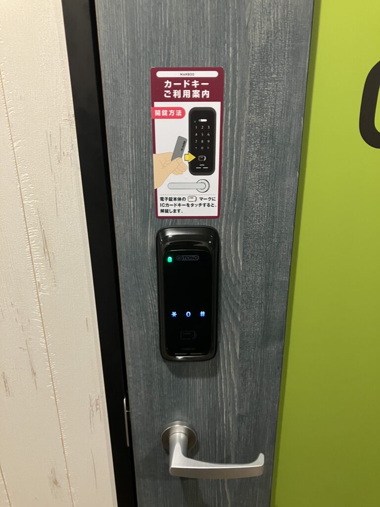 個室でオートロックの鍵付きです。受付でセキュリティーカード渡されるので部屋を出るときは持ち出さないと閉じ込めになるので注意です。