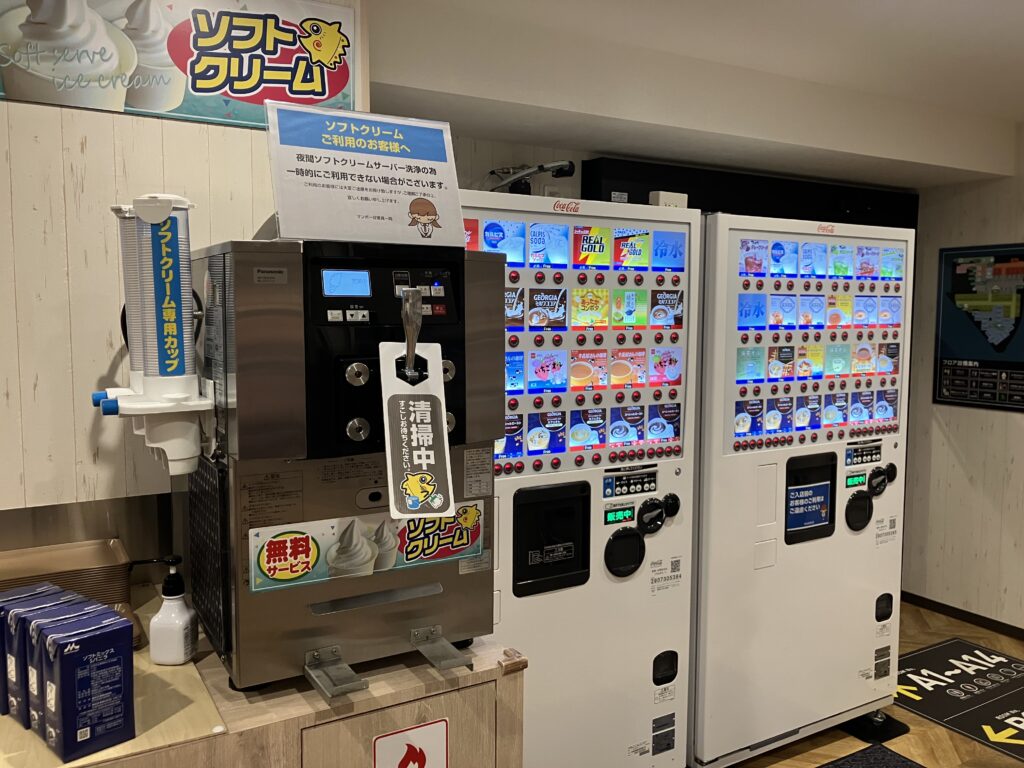 ドリンクバー(カップの自販機2台)とソフトクリームがついてます。