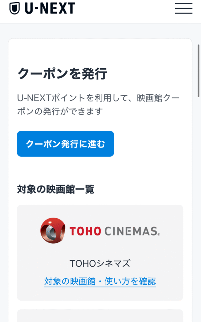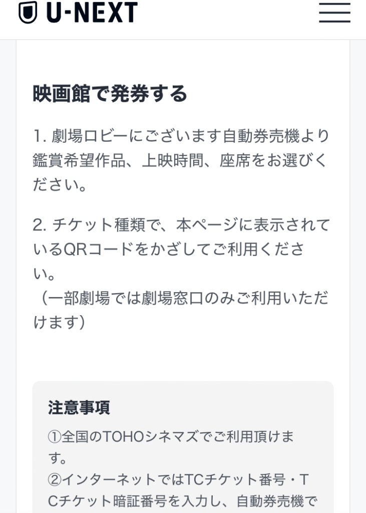 自分は東宝シネマで使用しました、当日に東宝シネマの券売機で見たい映画を選んで支払い画面のときに、ユーネクストから発行したクーポンのQRコードをかざしたら使用できました、めちゃくちゃ簡単でした。